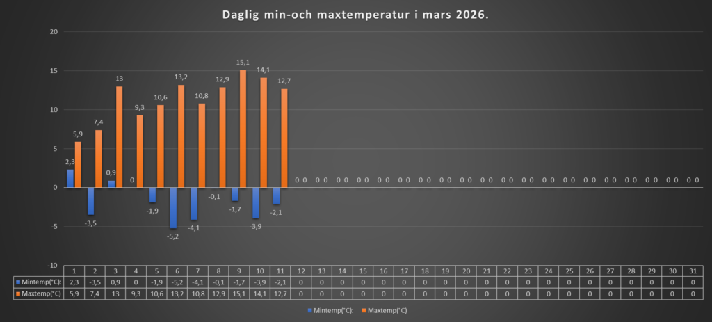 På morgonen var det halvklart, och lite under nollan. Förmiddagen bjöd på en hel del sol, men det var tunna molnslöjor som skymde solenn lite ibland. Under eftermiddagen ökade molnigheten, och det har varit både soliga och molniga perioder. Ytterligare en höjning på årshögsta temperaturen, +18,5 grader är den högsta så här långt i år.