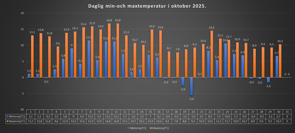 Ganska milt väder både dag och natt. Den lägsta temperaturen blev +6,7 grader, och den högsta dagstemperaturen blev +10,3 grader.