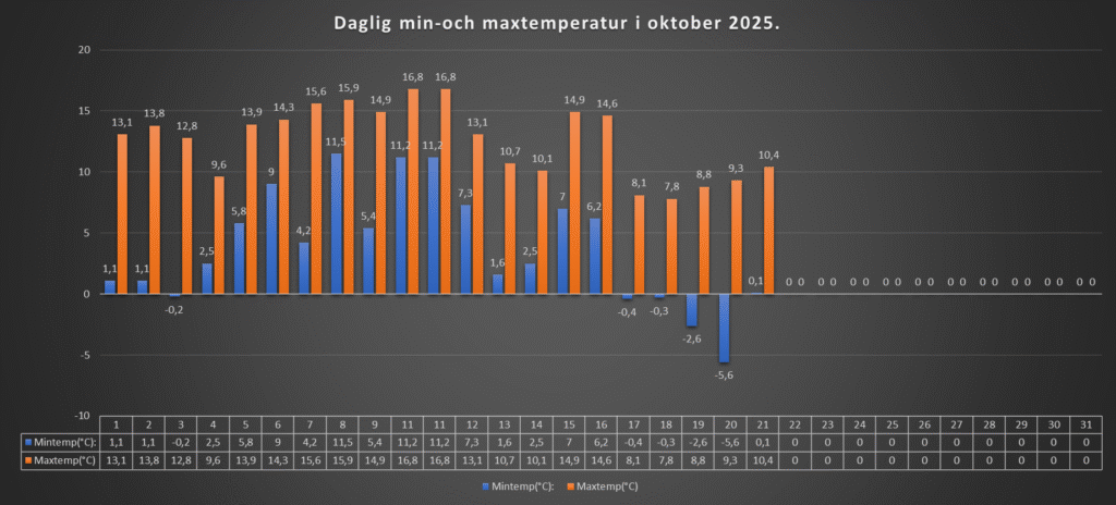 Den lägsta temperaturen blev +0,1 grad, och den högsta dagstemperaturen blev +10,4 grader. Snabba svängningar i temperaturen börjar bli allt vanligare tycker jag mig märka. Igår på morgonen hade vi ju -5,6 grader, och idag på morgonen hade vi +7 grader, alltså nästan 13 grader varmare idag.