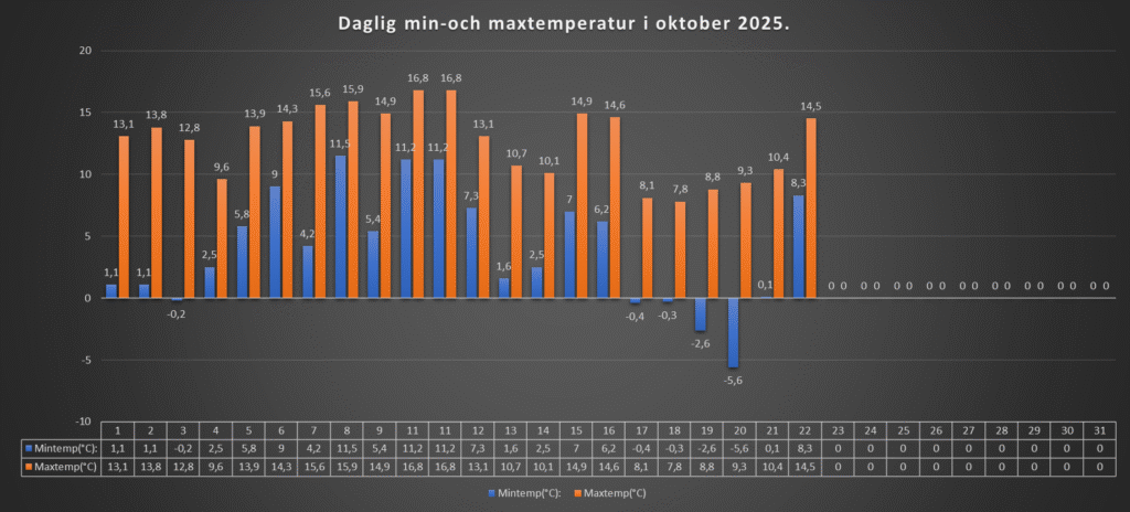 Ett för oktober milt dygn har det varit. Den lägsta temperaturen blev +8,3 grader, och den högsta dagstemperaturen blev +14,5 grader.