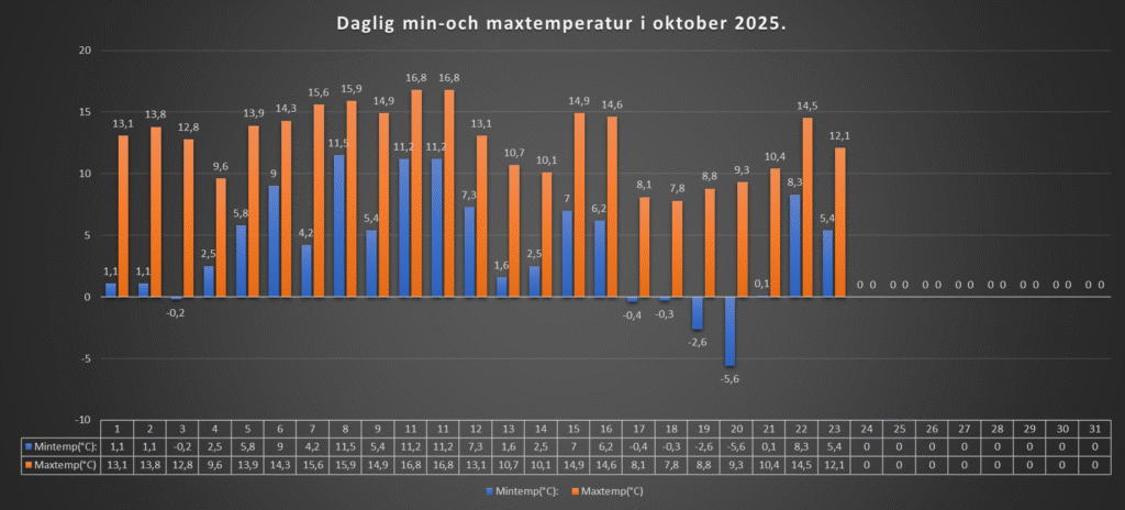 Den lägsta temperaturen i natt blev +5,4 grader, och den högsta dagstemperaturen blev +12,1 grader.