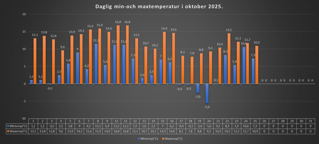 Den lägsta temperaturen blev +7,3 grader, och den högsta stannade på +10,9 grader.