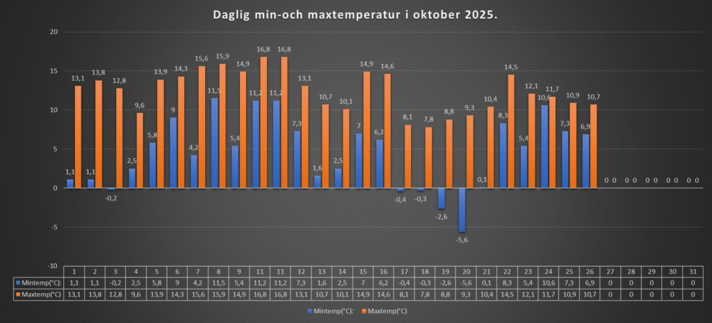 Den lägsta temperaturen blev +6,9 grader, och högsta dagstemperaturen blev +10,7 grader.