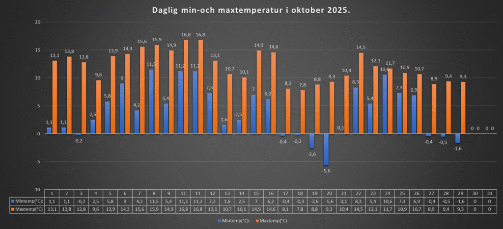 Den lägsta temperaturen blev -1,6 grader, och högsta dagstemperaturen blev +9,3 grader.