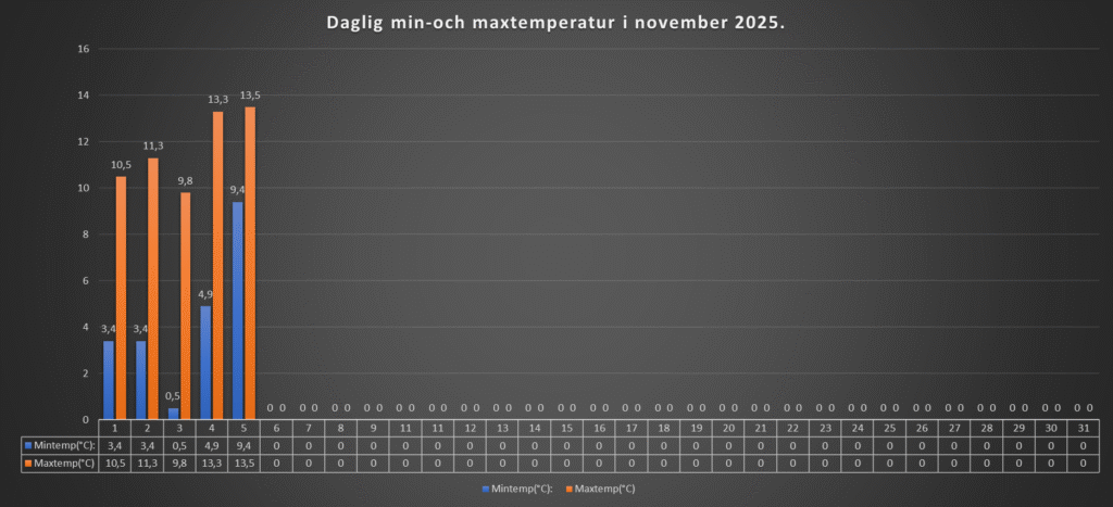 Det milda vädret fortsatte även idag. Molnen har dominerat den här dagen också, men precis som igår, stunder där man kunnat se himlen har också förekommit. Några regnstänk under eftermiddagen har vi också fått. Svag till måttlig vind mellan syd och sydväst.