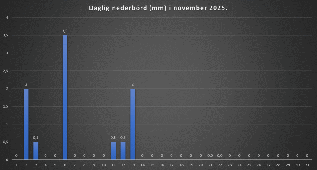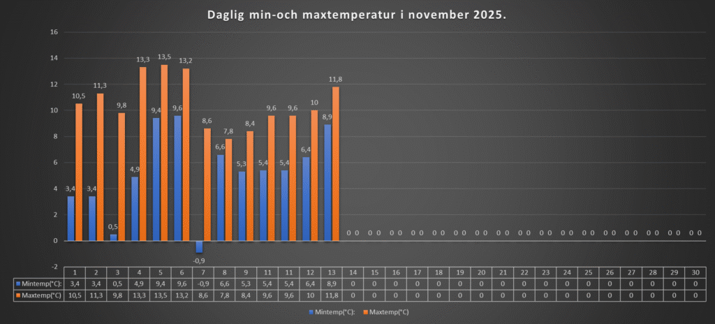 Det kom lite regn under natten till idag. Därefter så har vi haft en grå och mulen dag idag, med tidvis lite lätt regn. Milt för att vara i november, men en gråtrist novemberdag får vi nog sammanfatta dagen som.