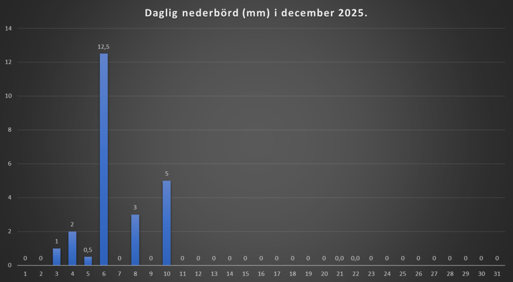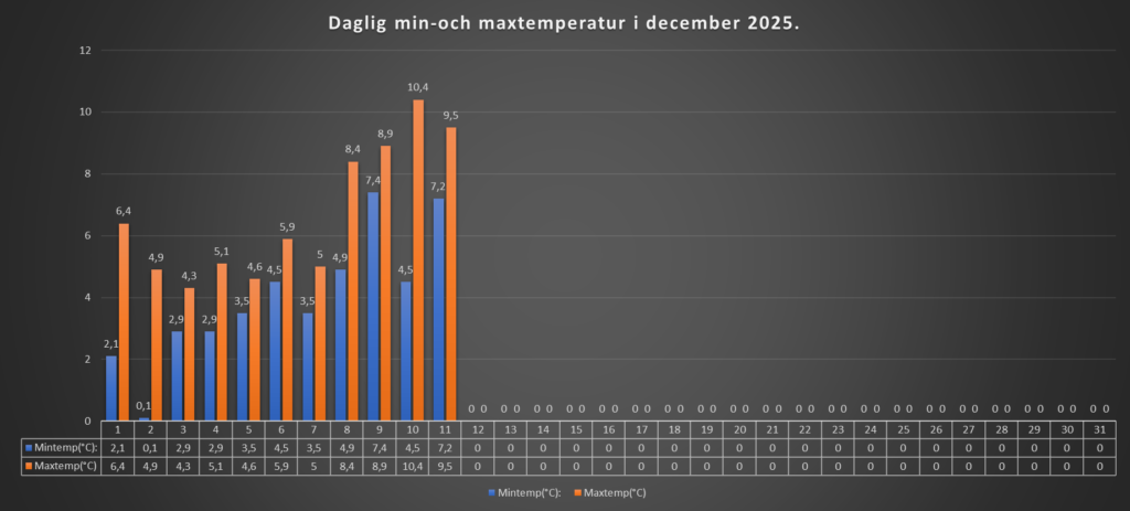 Det milda vädret har fortsatt även idag. Molnigheten har varierat, och det har kommit några omätbara regnstänk i eftermiddag också. Friska vindar från sydväst har det varit.
