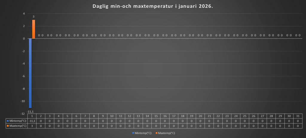 Nyårsaftonens kväll blev klar och kall. Efter 12-slaget, så började det dra upp moln, och på tidiga morgonen kom det lite snö. Därefter sprack molntäcket upp, och sedan har det varit växlande molnighet Temperaturen steg under dagen till några plusgrader.