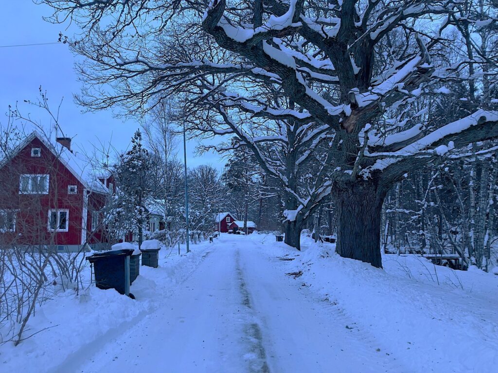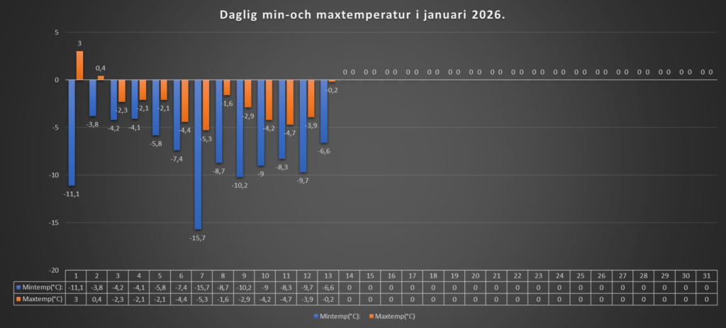 Idag har vi haft en mulen och grå dag, med tidvis lätt snöfall. Inga mängder denna gång. Temperaturen har hållit sig på minussidan, men den är så sakteliga på gång uppåt.