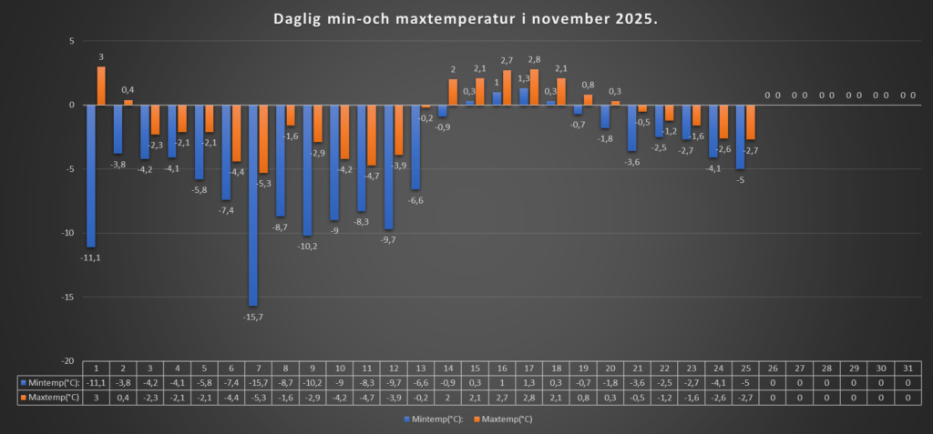 Under natten till idag, kom det ett par snöbyar ytterligare. Därefter så har dagen varit mulen, men mestadels uppehållsväder. Mitt på dagen var det lite ljusare också, jämfört mot de senaste dagarna. Några minusgrader både dag och natt, och prognoserna pekar på fortsatt minusgrader och även mera snö under veckan som kommer. Årstiden vinter visar att den fortfarande existerar, trots allt.