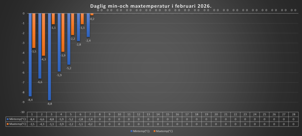 Under gårdagskvällen och natten kom det lite mera snö. Lördagen har varit mulen, men det har varit uppehållsväder. Lite mildare både dag och natt nu, men fortfarande minusgrader hela dygnet (isdygn).