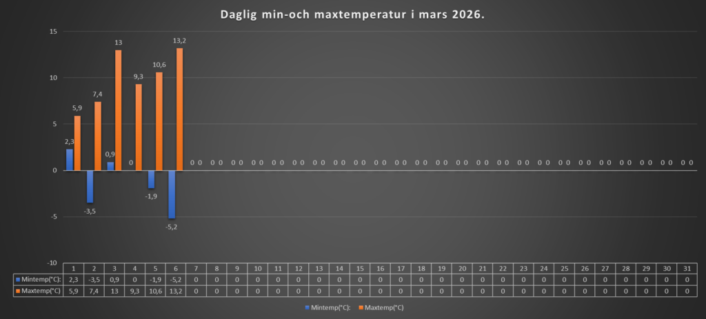 Efter en klar och kylig natt med flera minusgrader, fick vi en dag med sol från molnfri himmel, och lite vårvärme. +13,2 grader i maxtemp idag, och det är årshögsta noteringen så här långt.