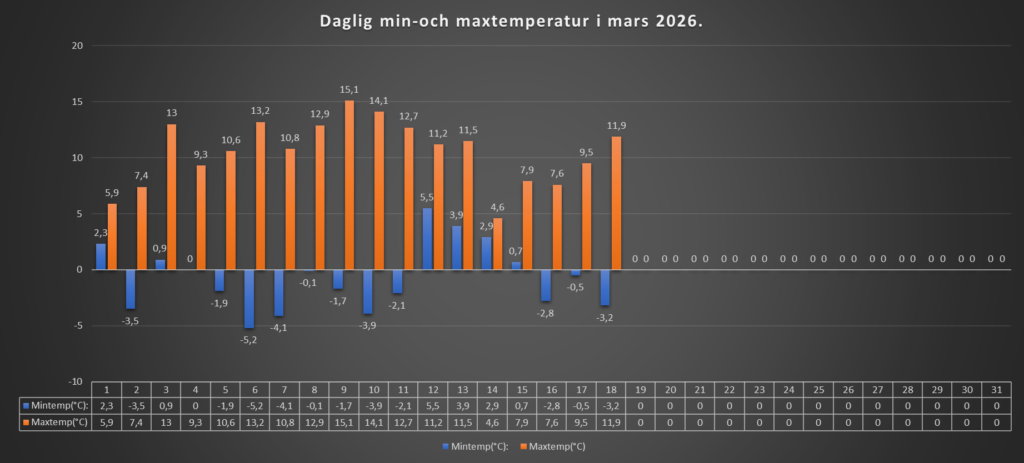 Efter en natt med flera minusgrader, fick vi en fin vårdag med sol från i princip molnfri himmel hela dagen, och en hyfsad vårtemperatur också.