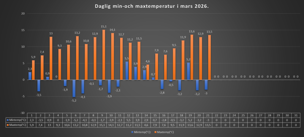 Ännu en klar och kall natt, med 3 minusgrader som lägst. Därefter har vi haft en mycket fin vårdag med sol från klar himmel hela dagen, och vårvärme också.