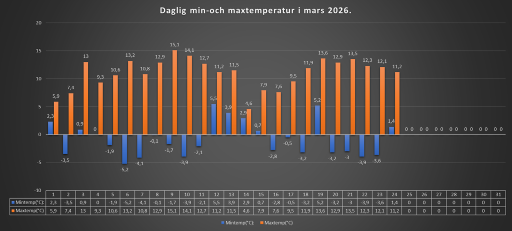 Det här dygnet har det varit plusgrader hela dygnet. Molnen har dominerat både natten och dagen. Det har inte varit helt mulet, men solen har inte orkat lysa igenom idag heller.