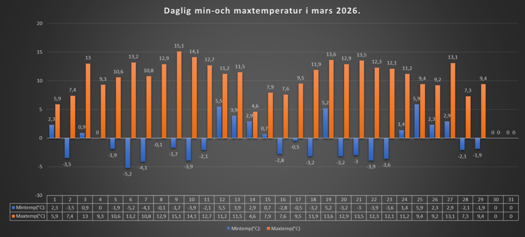 Det klarnade upp under natten, och temperaturen sjönk till minusgrader. Söndagens väder blev växlande molnighet och solen har haft övertaget. Sparsamt med vårvärme, och frisk vind idag också.