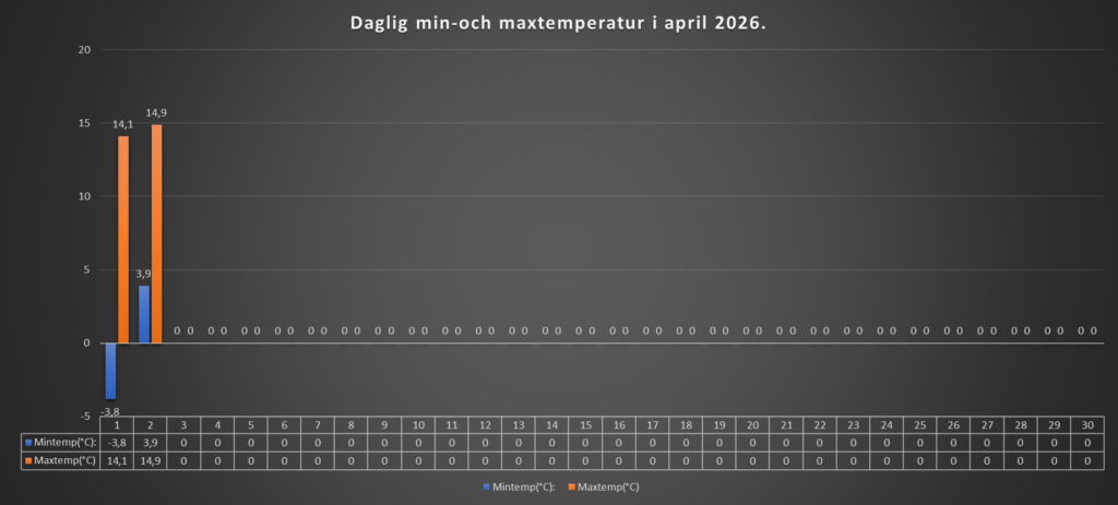 På morgonen och förmiddagen var det molnigt idag. Det kom också en lätt regnskur (ej mätbart). Vid lunchtid sprack molntäcket upp, och under eftermiddagen har vi haft växlande molnighet, och en hel del sol. Plusgrader hela dygnet, och skön vårvärme under eftermiddagen.