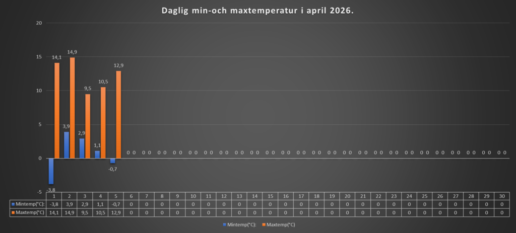 Under natten till idag, var det halvklart och minusgrader. Molnen kom snabbt på morgonen, och på förmiddagen, kom det lite regn också. Vid lunchtid lättade molnen, och under eftermiddagen har det varit växlande molnighet, och en hel del sol. På morgonen var det nästan vindstilla, men vinden har ökat snabbt under dagen, och i eftermiddag har vi haft vindbyar på över 20 m/s.