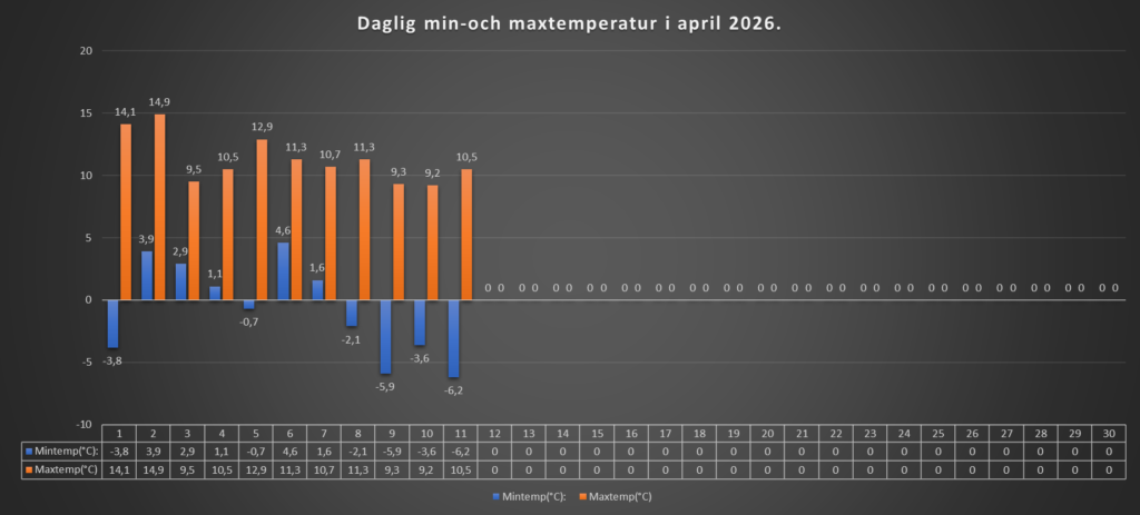 En kall natt igen med -6,2 grader som lägst. Helt molnfri himmel och en värmande sol hela dagen.