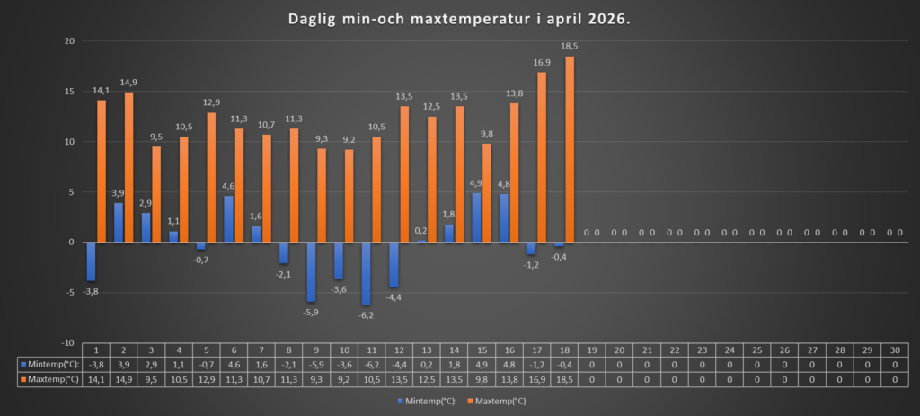På morgonen var det halvklart, och lite under nollan. Förmiddagen bjöd på en hel del sol, men det var tunna molnslöjor som skymde solenn lite ibland. Under eftermiddagen ökade molnigheten, och det har varit både soliga och molniga perioder. Ytterligare en höjning på årshögsta temperaturen, +18,5 grader är den högsta så här långt i år.