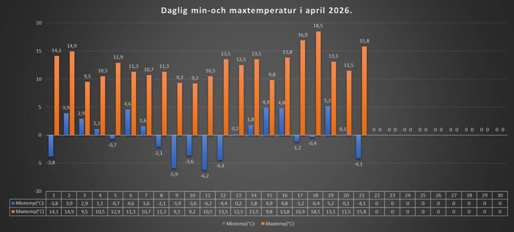 En klar och kylig natt med drygt 4 minusgrader. Därefter fick vi en solig dag. Helt molnfri himmel hela dagen. Våren när den är som bäst!