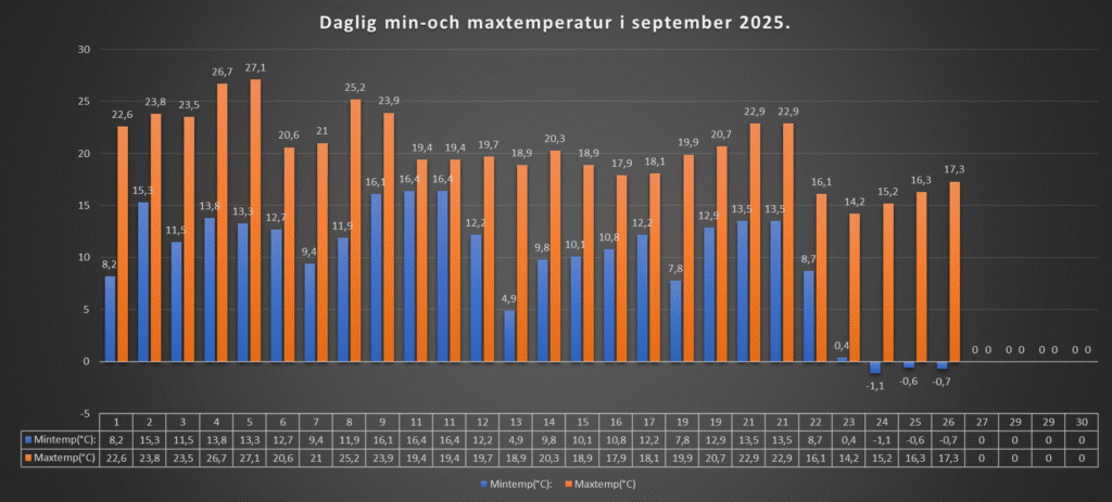 Den lägsta temperaturen blev -0,7 grader, och den högsta dagstemperaturen blev +17,3 grader. Skön höstvärme.