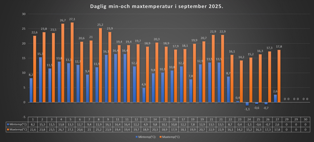 I natt drog det förbi lite moln under efternatten, vilket gjorde att temperaturen inte sjönk under nollan. Det var dock lite markfrost på morgonen. Förmiddagen dominerades av solen, medans det under senare delen av eftermiddagen kom lite tunnare moln. Ännu en mycket fin höstdag läggs till i samlingen denna månad.