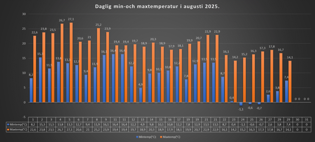 Den lägsta temperaturen blev +7,4 grader, och den högsta blev +14,1 grader.