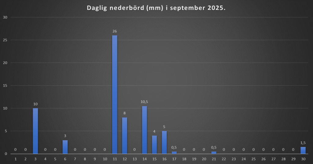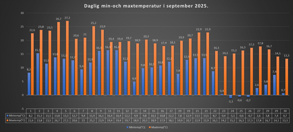 Den lägsta temperaturen blev +0,7 grader, och den högsta dagstemperaturen blev +13,3 grader. Hösttemperatur idag.