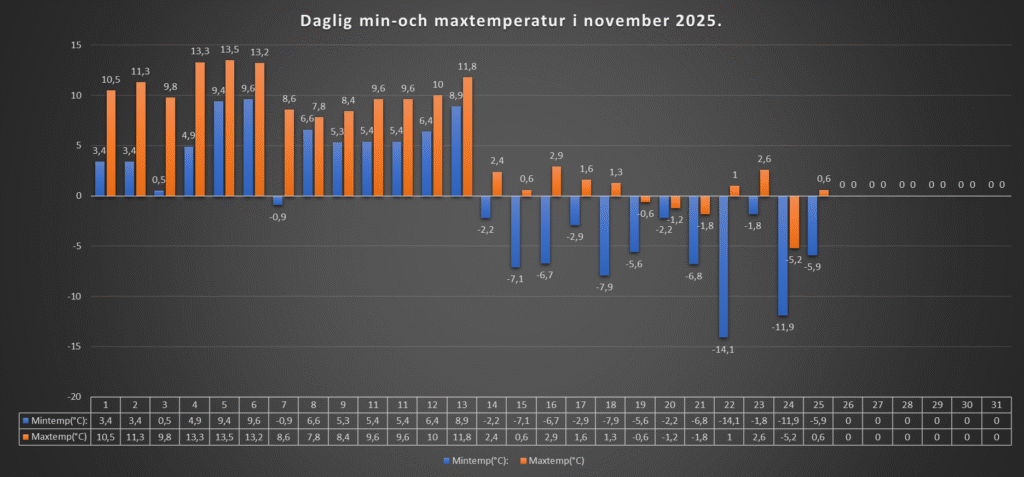 Under natten till idag, kom det lite snö igen. På dagen har det varit mulet hela dagen, och det har kommit lite lätt snöfall tidvis också.