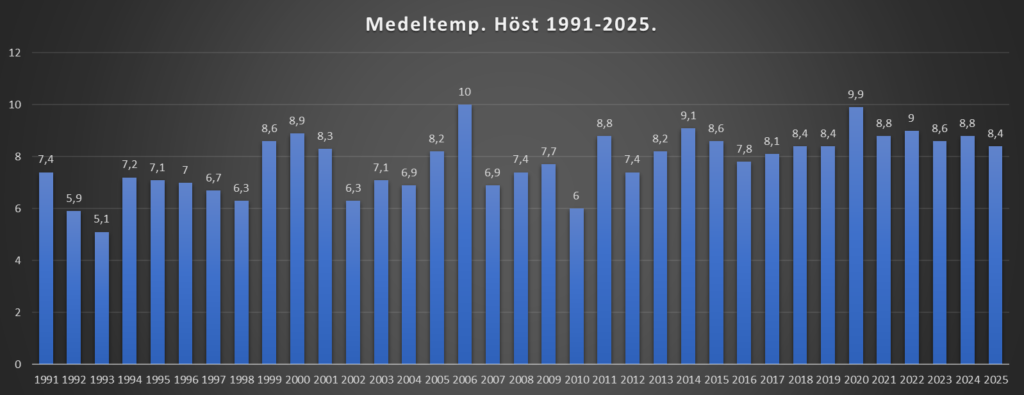 Det är september som sticker ut rejält, medan oktoberöverskottet tas ut av novembers temperaturunderskott. För att få perspektiv på hur medeltemperaturen varit i höstarna genom åren 1991-2025, så lägger jag upp det i diagrammet nedanför här: