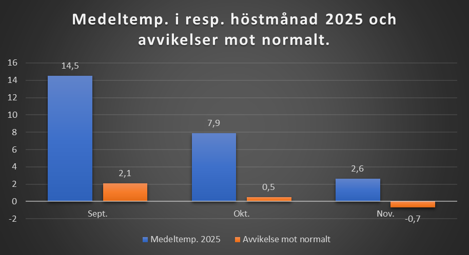 Medeltemperaturen i årets höst blev +8,4 grader, och det är 0,7 grader varmare jämfört mot normalt. Jag visar hur temperaturavvikelserna i de tre höstmånaderna varit i stapeldiagrammet nedanför här: