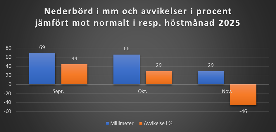 Nederbörden i höst blev 164 millimeter, och det är 5% mera jämfört mot normalt. Diagrammet nedan visar nederbördsmängden och avvikelserna mot normalt i resp. höstmånad.