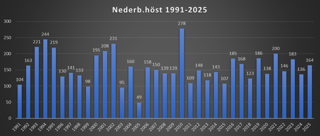 Diagrammet nedan visar nederbördsmängderna i årstiden höst genom åren 1991-2025: