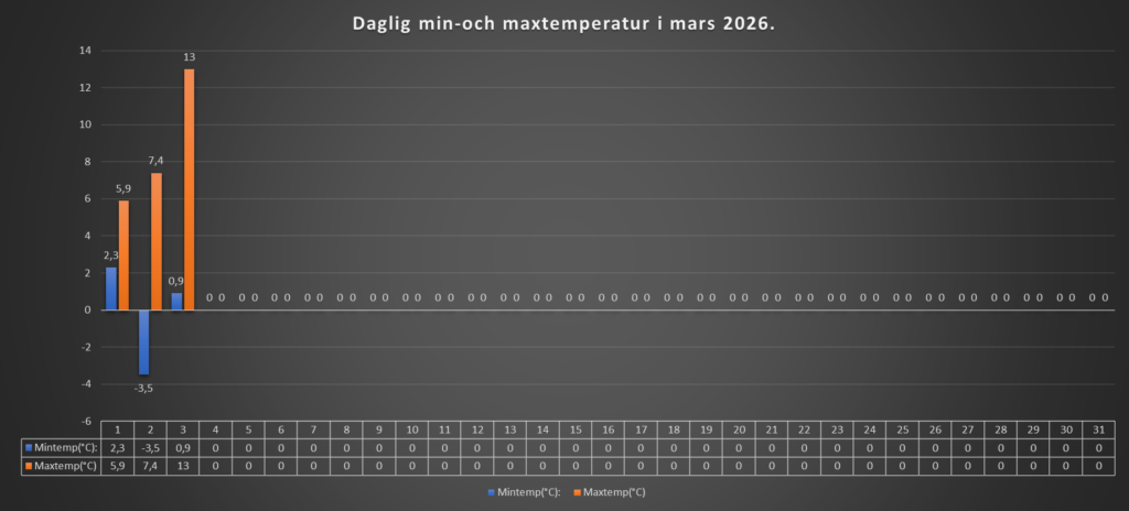 På morgonen och förmiddagen var det övervägande soligt, med bara tunna molnslöjor. Efter lunch drog det förbi en molnskärm, men efter det klarnade det upp igen. Vinden ökade efter lunch. Idag har vi har haft den varmaste dagen såhär långt in på året, +13 grader blev maxtemperaturen.