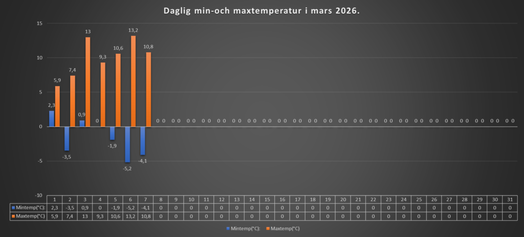 Klar himmel och minusgrader under natten. På morgonen så började det komma upp tunna moln, och molnigheten har ökat sakta vartefter dagen gått.