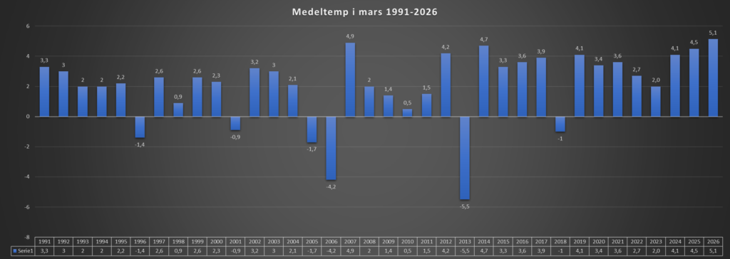 Så varm marsmånad har vi bara haft en gång tidigare genom åren 1931-2026, och det var år 1990. Det året var medeltemperaturen i mars +5,4 grader.