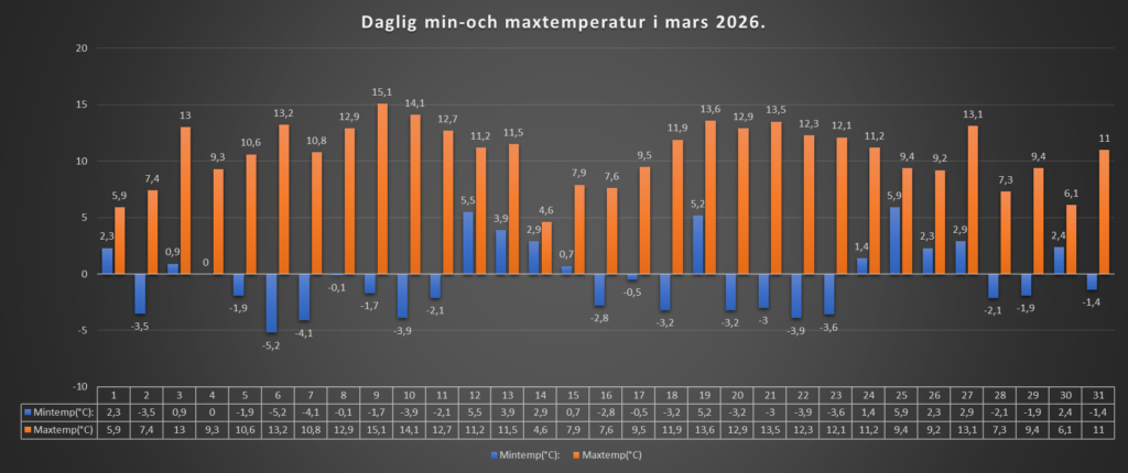Här kommer sammanfattningen av vädret i mars 2026. Väderdata för årets marsmånad är hämtade från min privata väderstation här i Fågelfors. Statistiken som jag använder och jämför mot, är hämtad från SMHI:s närmaste mätstationer Blankaström, och Drageryd för åren 1931-2012. Från 2013 och framåt är det min egna, privata väderstation som levererar siffrorna. Nuvarande ”normalperiod” som används att jämföra mars 2026 mot, är åren 1991-2020. Där jag använder ordet ”normalt” i texterna här, menas alltså då medeltalen för referensperioden 1991-2020.