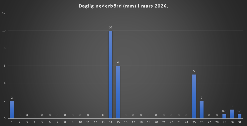 Nederbörd har vi fått 27 millimeter i mars. Det motsvarar 104% av den normala månadsnederbörden, så det blev så nära normalt man kan komma: