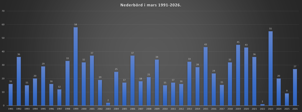 I diagrammet nedanför visar jag nederbördsmängderna för mars i respektive år, under perioden 1991-2026: